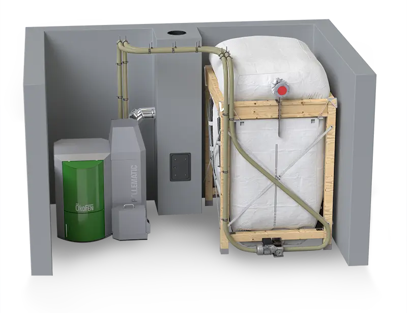 La Pellematic està disponible per a alimentació automàtica a partir d’una sitja de pèl·lets, tant a través d’un vis sens fi com amb succió pneumàtica. També hi ha un model amb una tremuja incorporada per a càrrega manual amb sacs