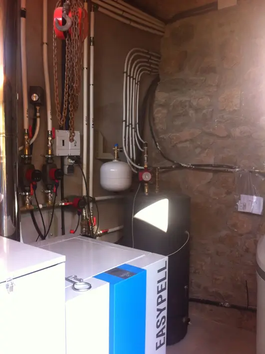 La instal·lació es completa amb un dipòsit d’ACS de 200 litres i una tolva incorporada de 130 kg, que proporcionen autonomia i eficiència en el consum energètic.