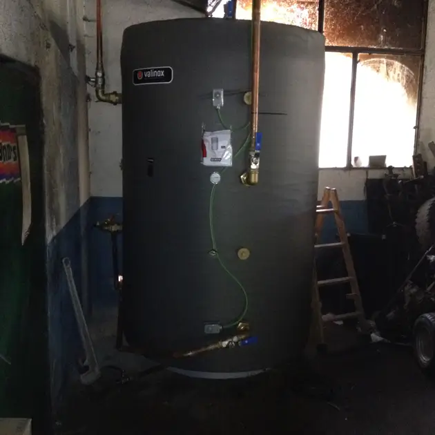 El sistema compta amb un circuit de calefacció amb radiadors i un dipòsit d’inèrcia de 2000 litres amb dipòsit d’ACS de 200 litres, que permet aprofitar al màxim la calor generada per la combustió de la llenya.